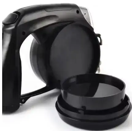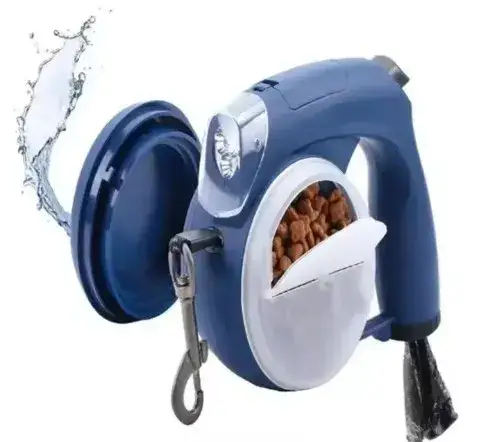 חגורה נמתכת עד 4 מטר. 4 ב 1, אשר מכילה פנס LED, מיכל לשתיה, מיכל לאוכל ומקום לשקיות הגללים. מתאים לכלבים עד 7.5 קילו. צבע שחור.