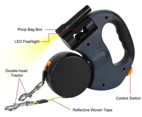 רצועה נמתכת ל 3 מטר עבור שני כלבים המסתובבת 360 מעלות עם מתקן לשקיות גללי הכלב ופנס. צבע כחול.