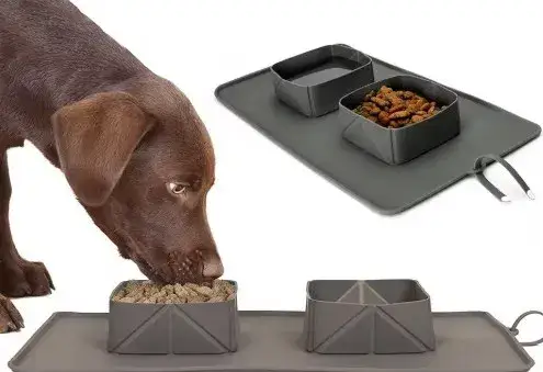 משטח מסיליקון עם שני קעריות לאוכל ושתיה לכלב/חתול. משטח מתקפל עם תיק אחסון. גודל: 600 מ"ל. צבע אפור.