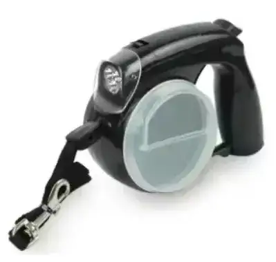 חגורה נמתכת עד 4 מטר. 4 ב 1, אשר מכילה פנס LED, מיכל לשתיה, מיכל לאוכל ומקום לשקיות הגללים. מתאים לכלבים עד 7.5 קילו. צבע שחור.